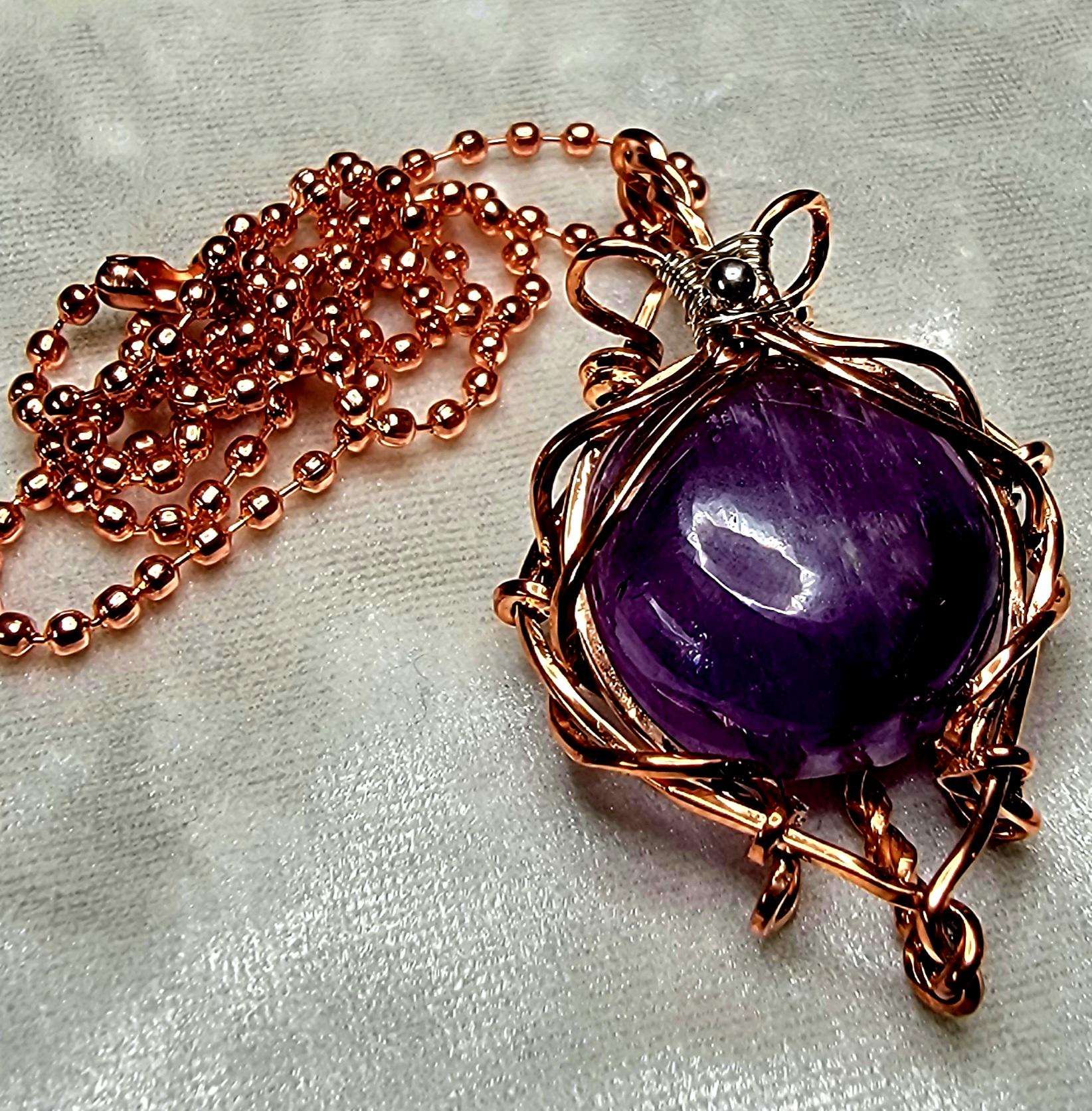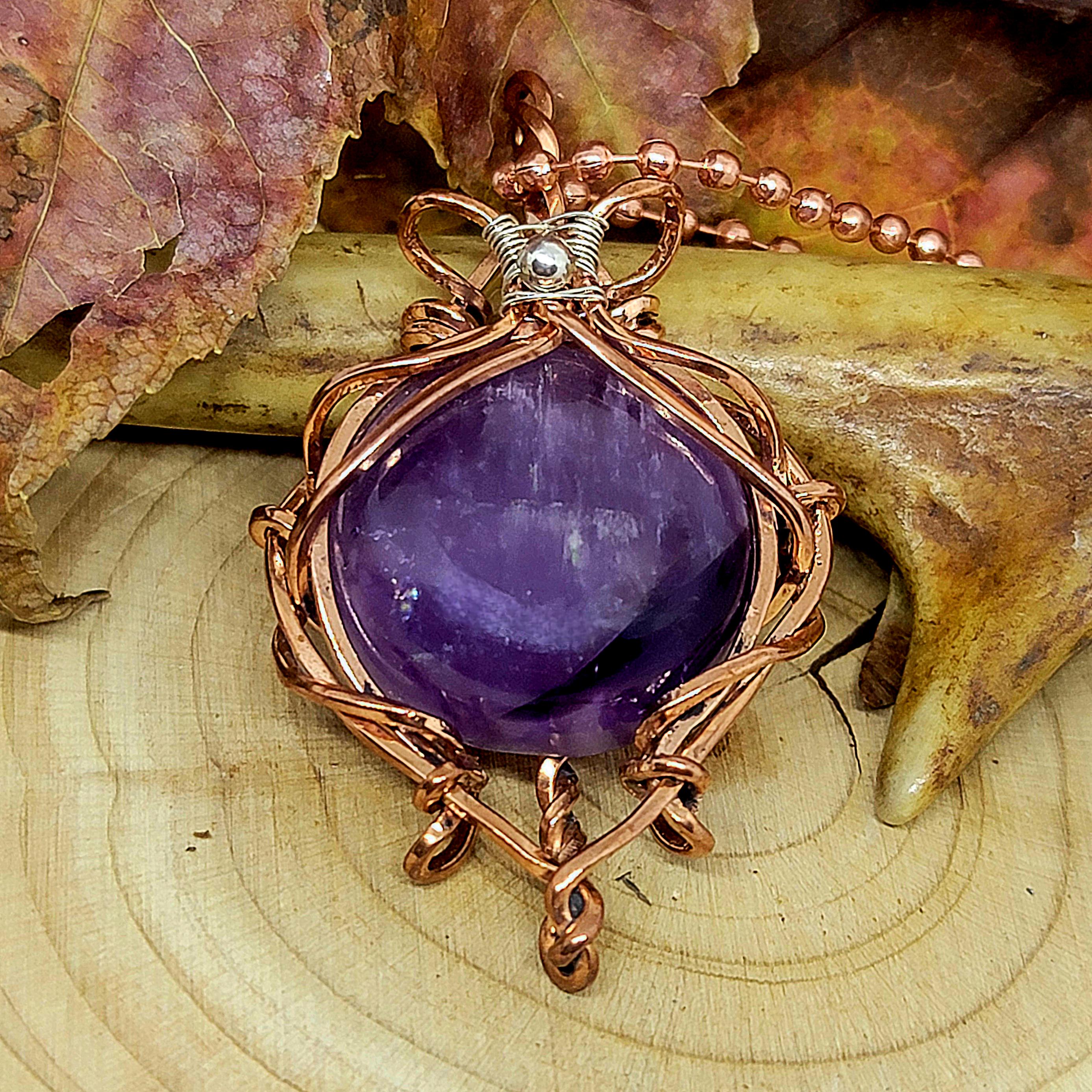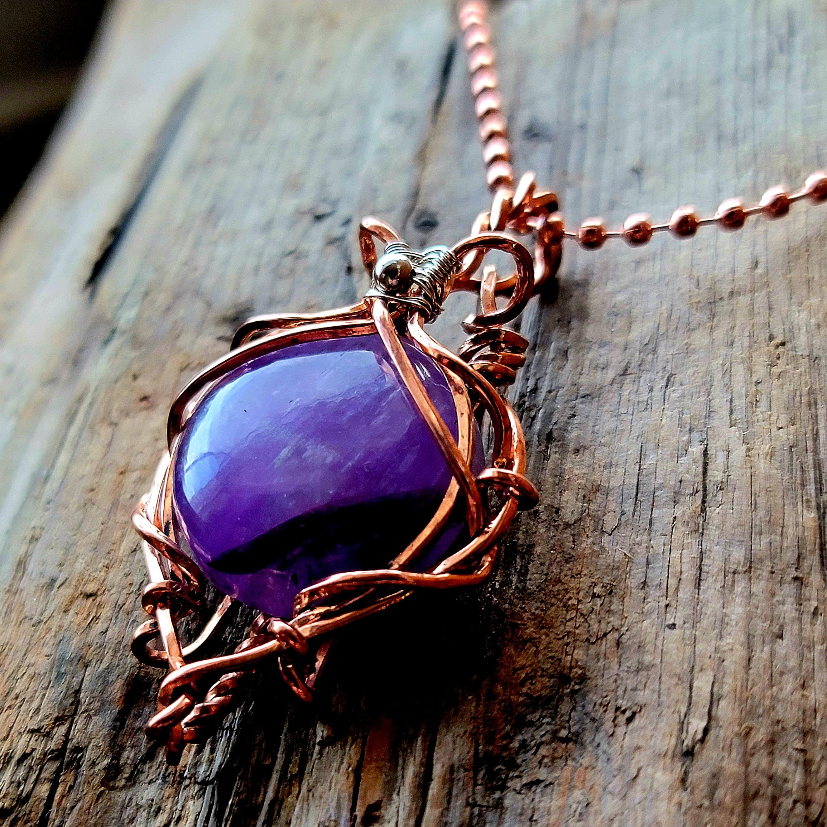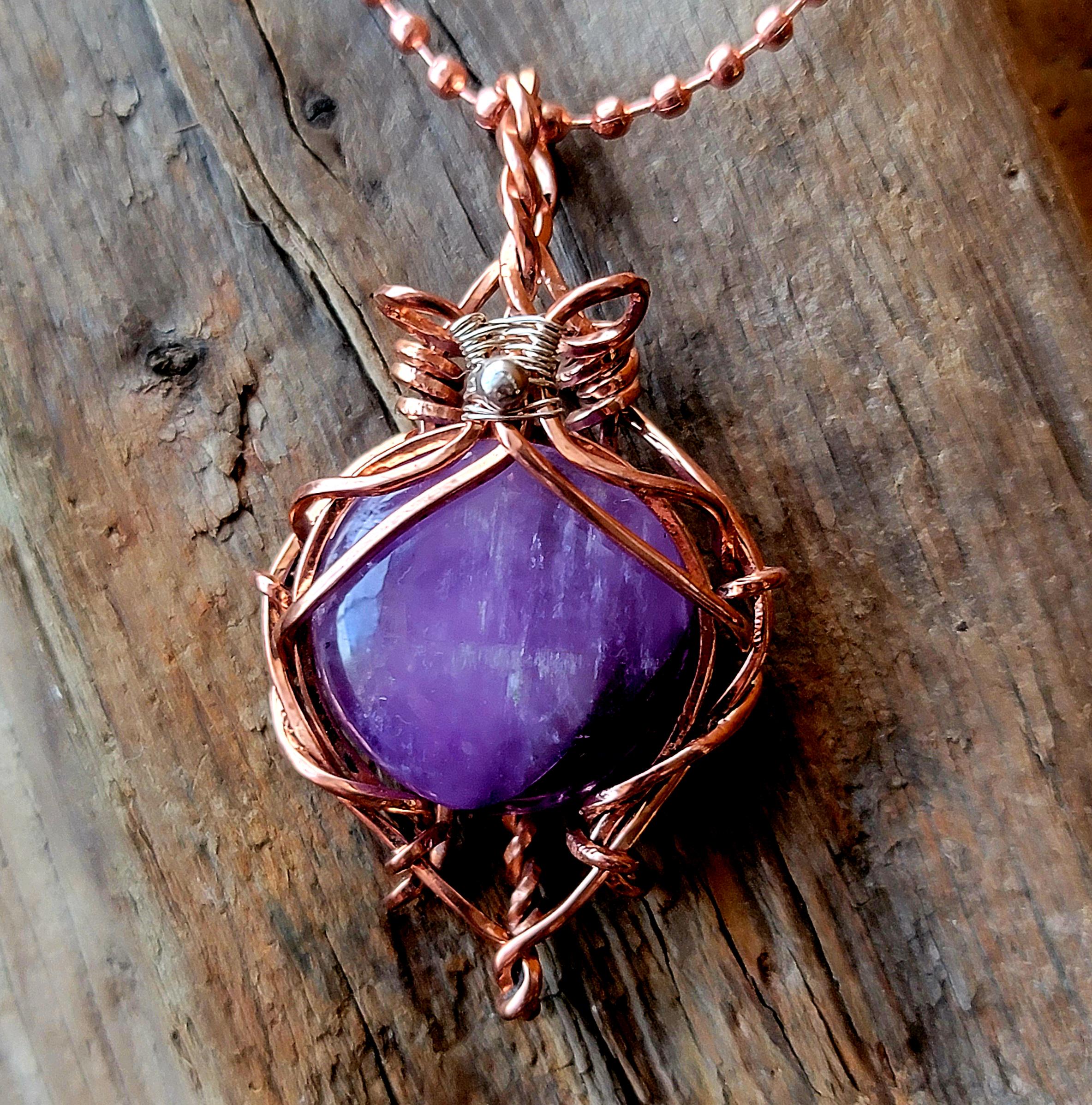 Beautiful smooth round Amethyst cabochon in a wire copper wire wrap setting. One of a kind, substantial but not heavy. The stone in this pendant is round, but reminds me of a heart shape in the wrap!