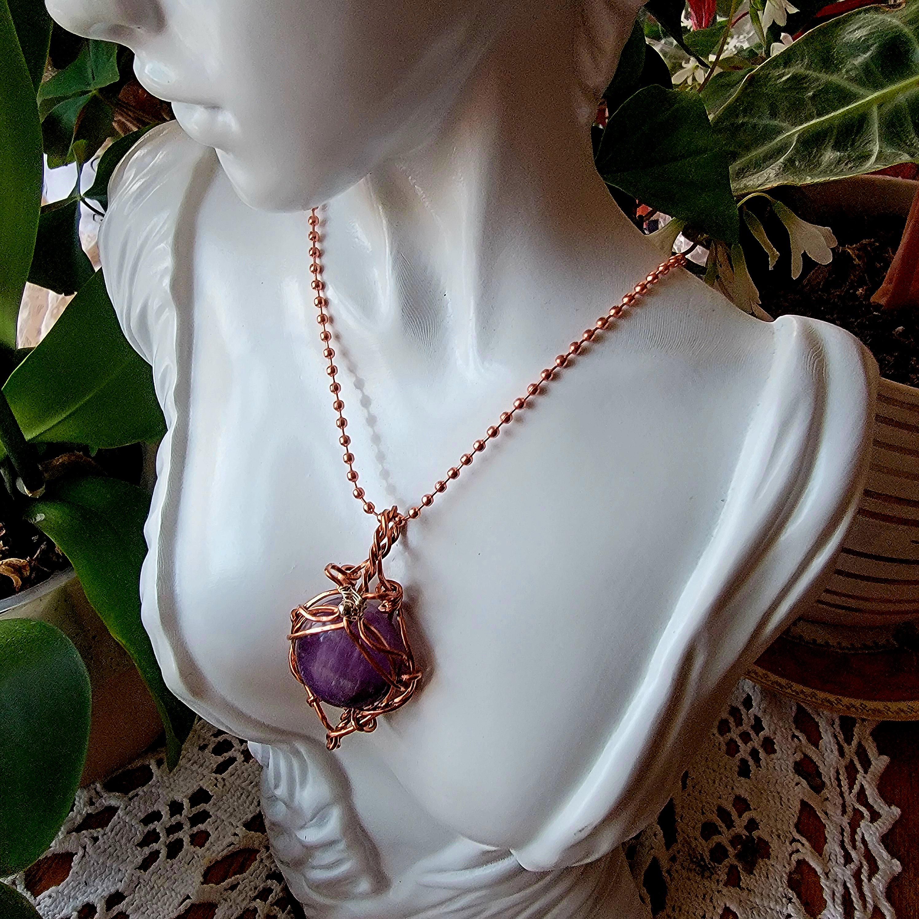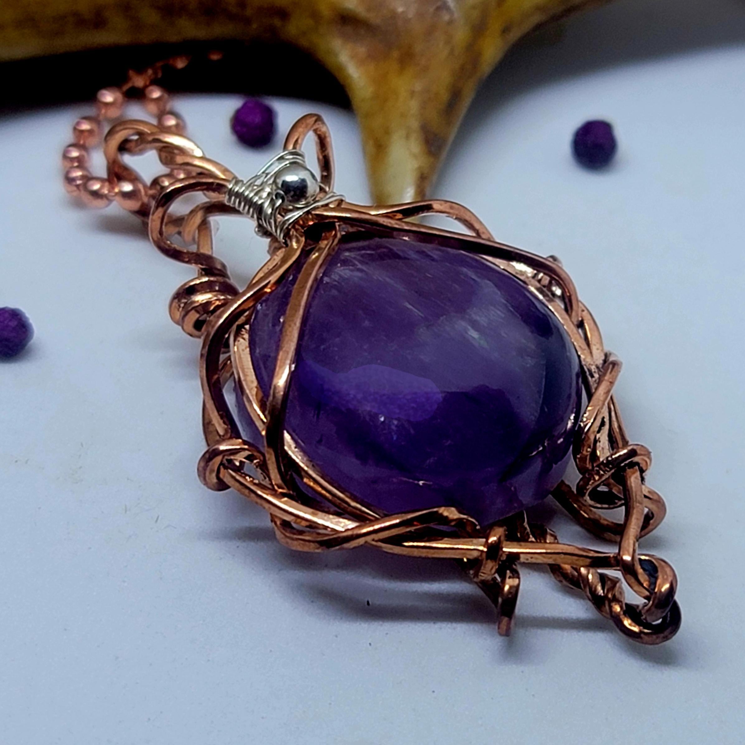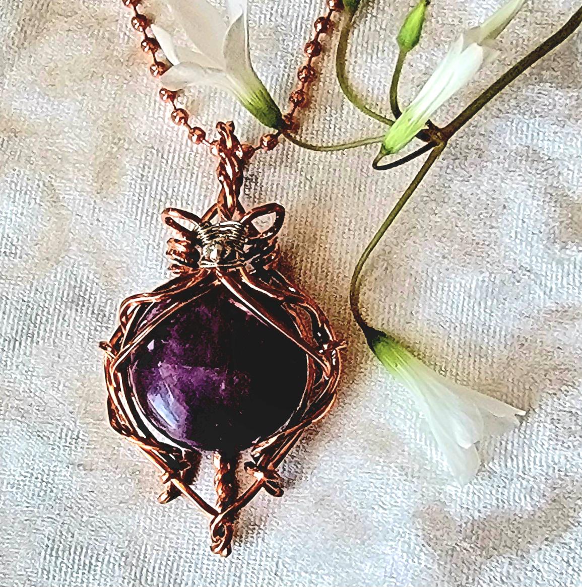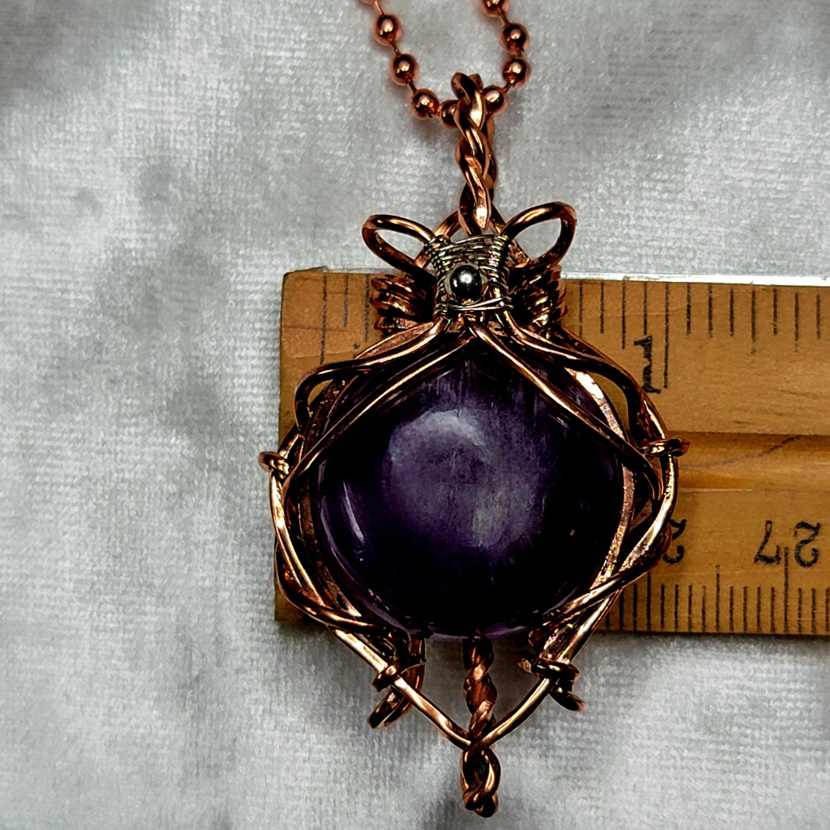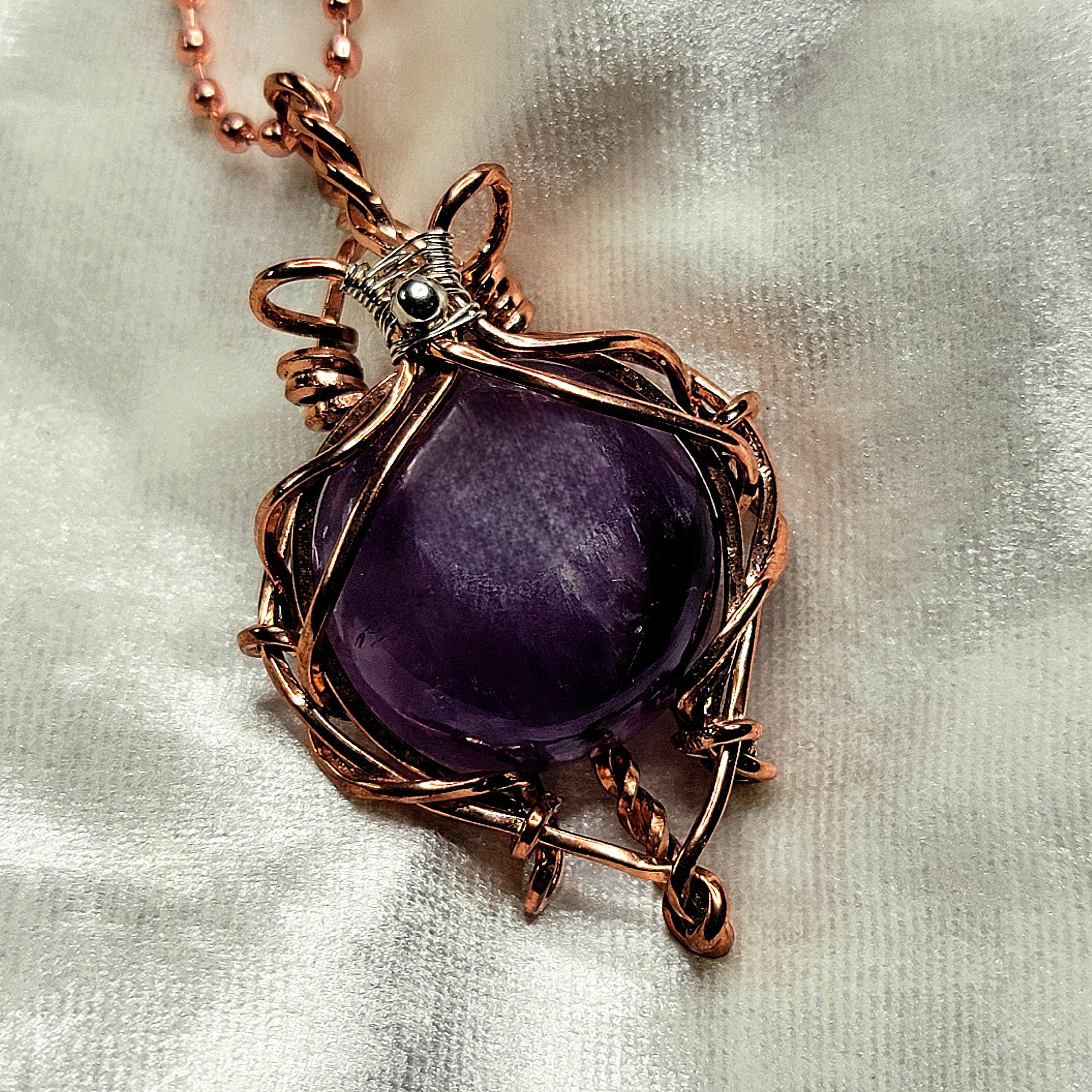 Beautiful smooth round Amethyst cabochon in a wire copper wire wrap setting. One of a kind, substantial but not heavy. The stone in this pendant is round, but reminds me of a heart shape in the wrap!
