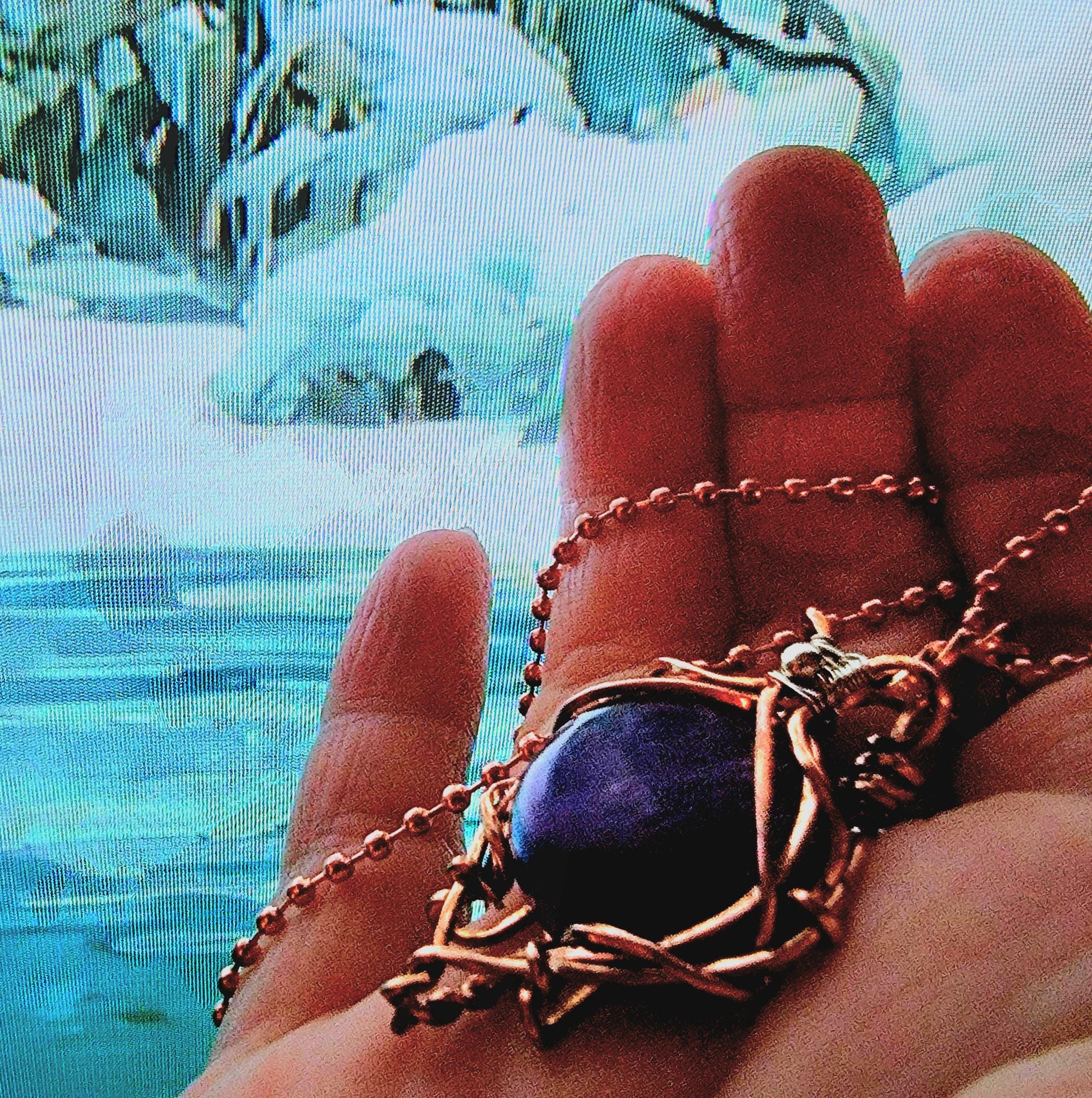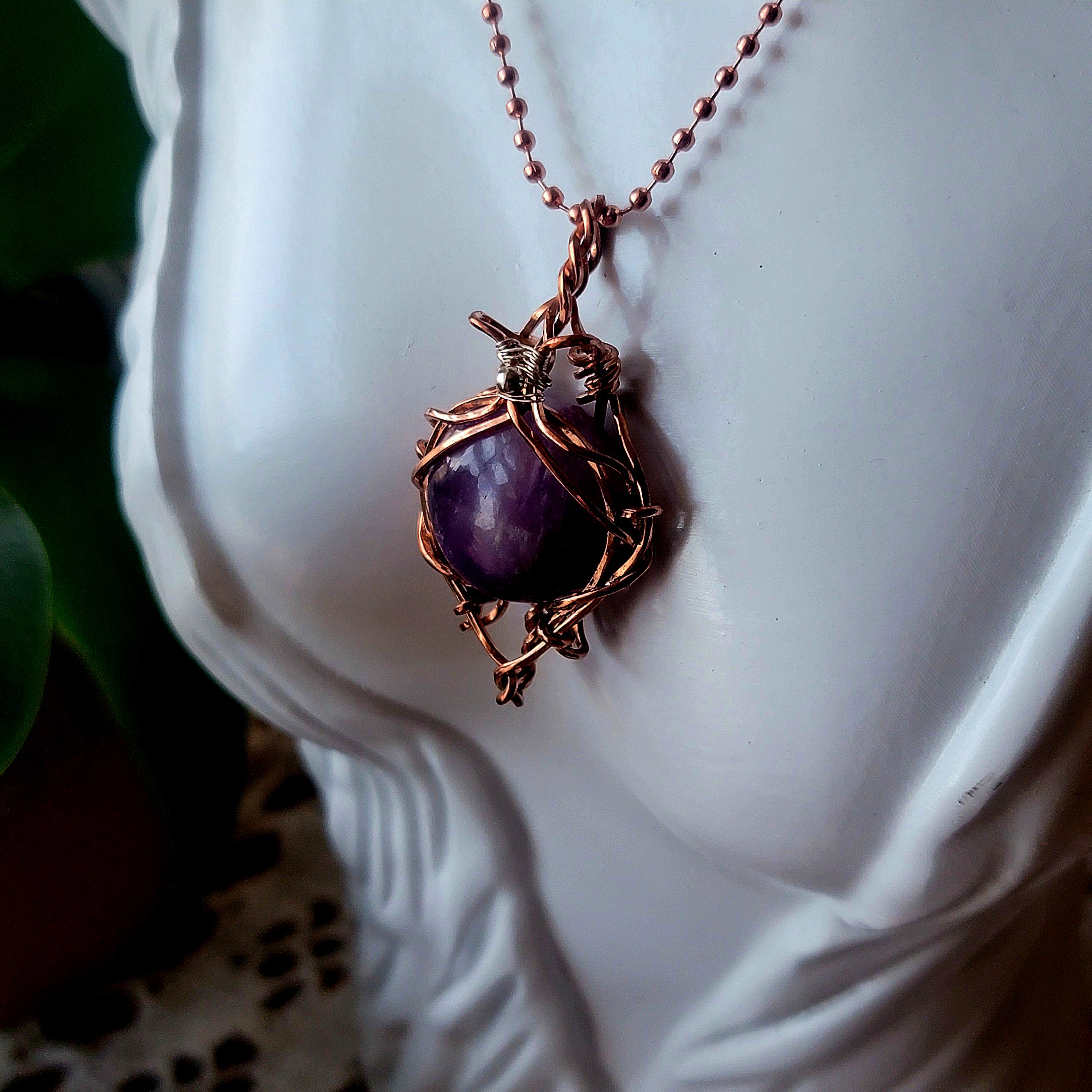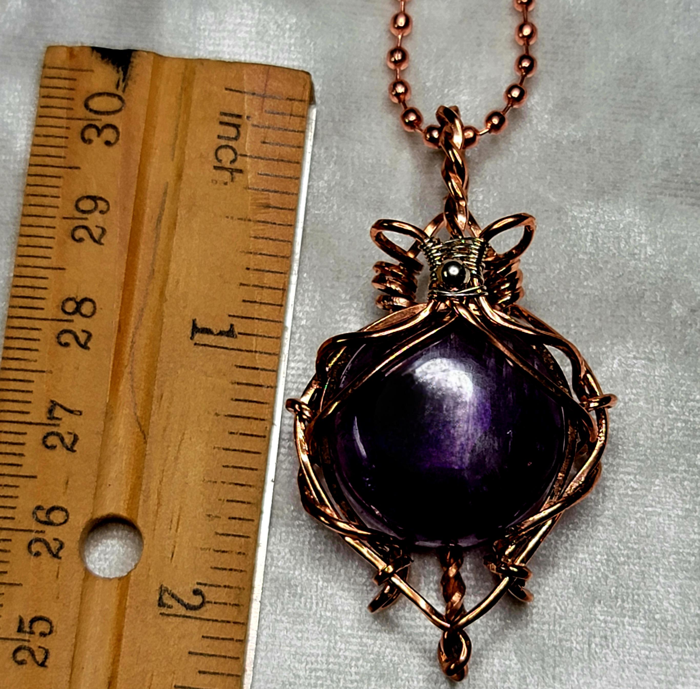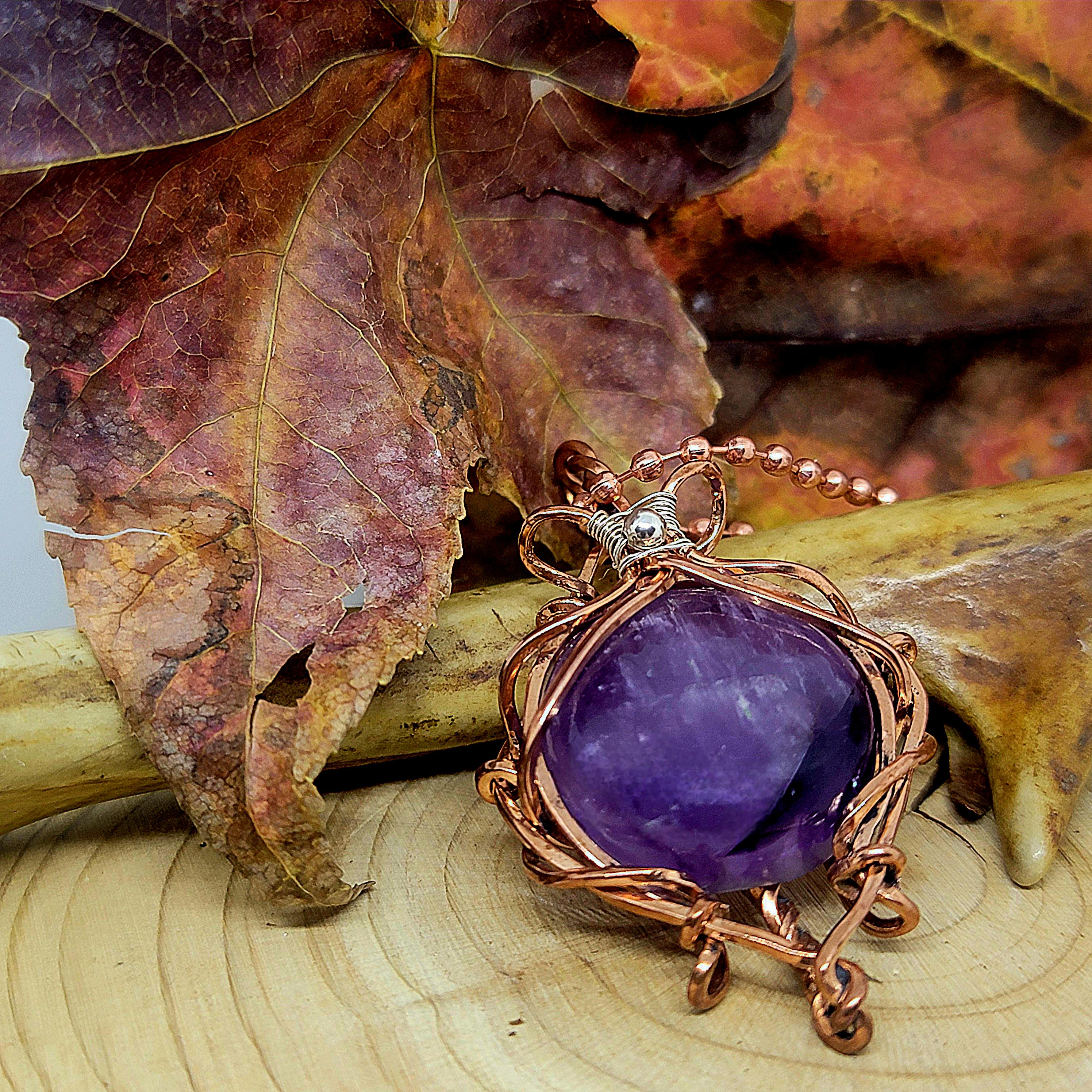 Beautiful smooth round Amethyst cabochon in a wire copper wire wrap setting. One of a kind, substantial but not heavy. The stone in this pendant is round, but reminds me of a heart shape in the wrap!