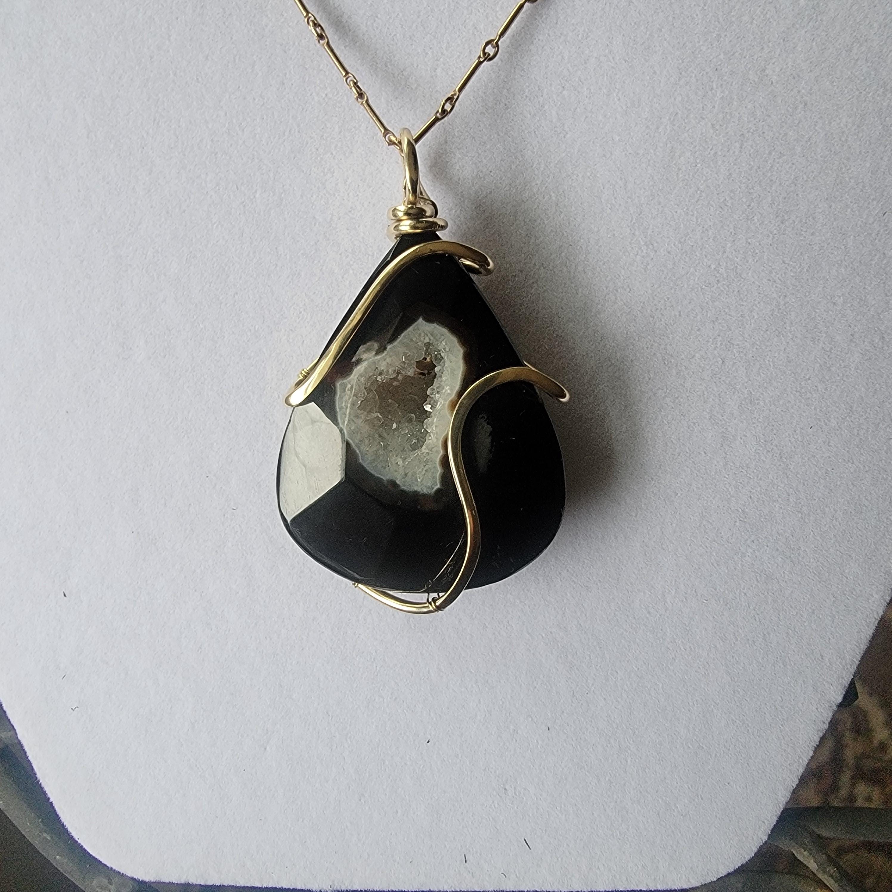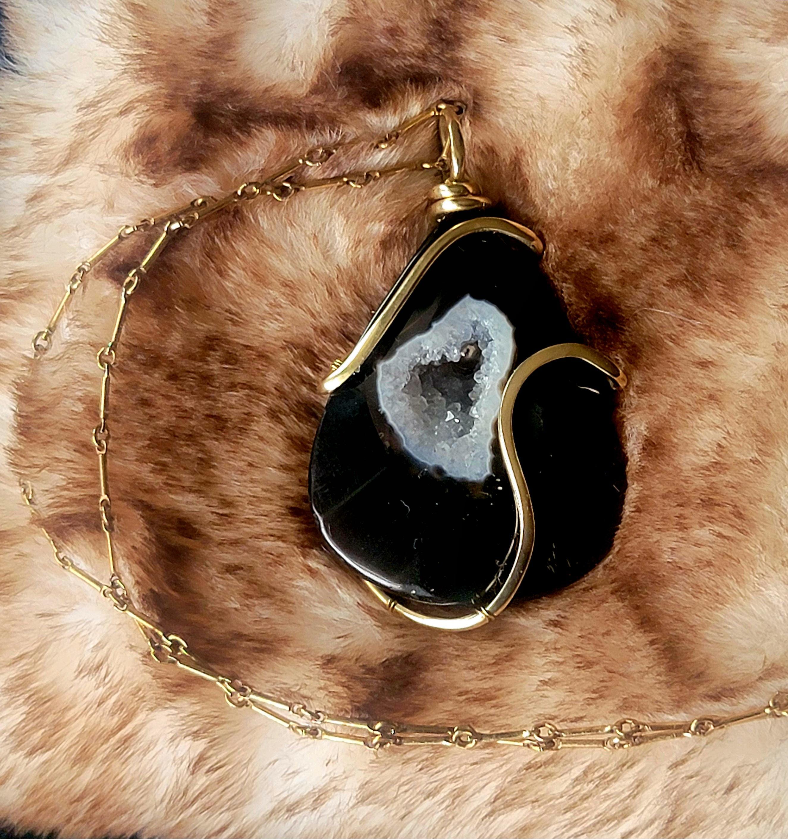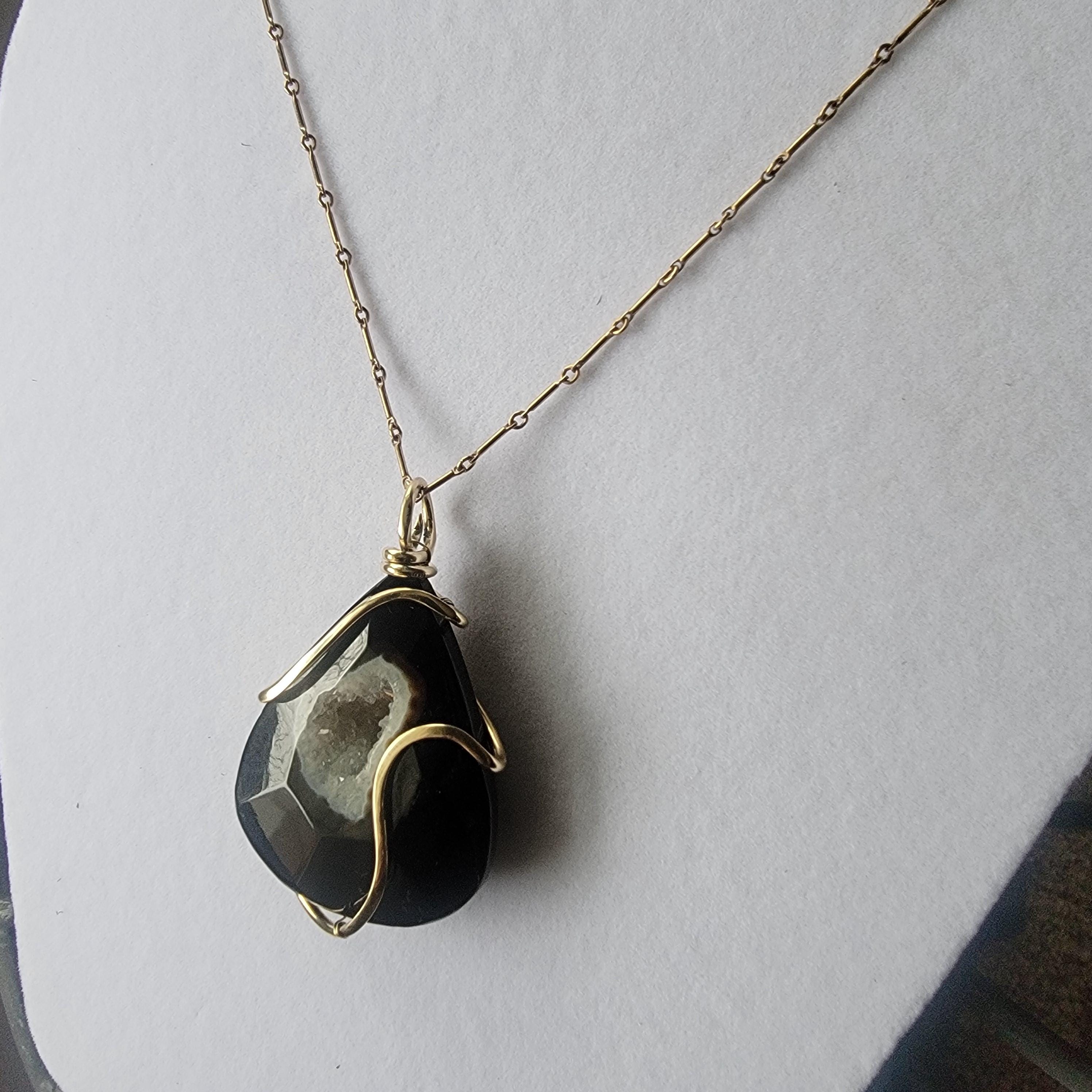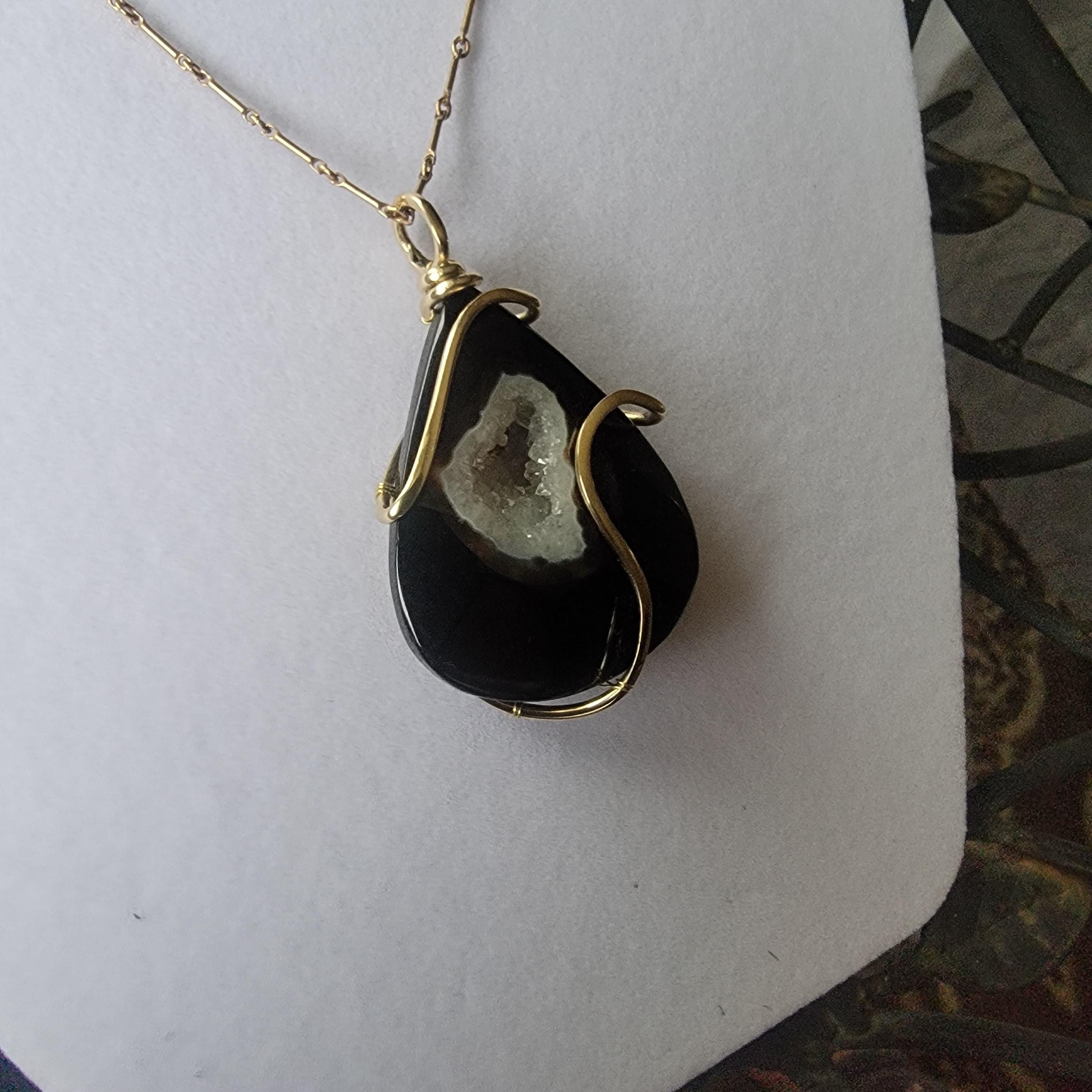 A simple and elegantly wrapped stone in a minimalist setting, this ample -sized druzy agate pendant is the definition of sophistication!
