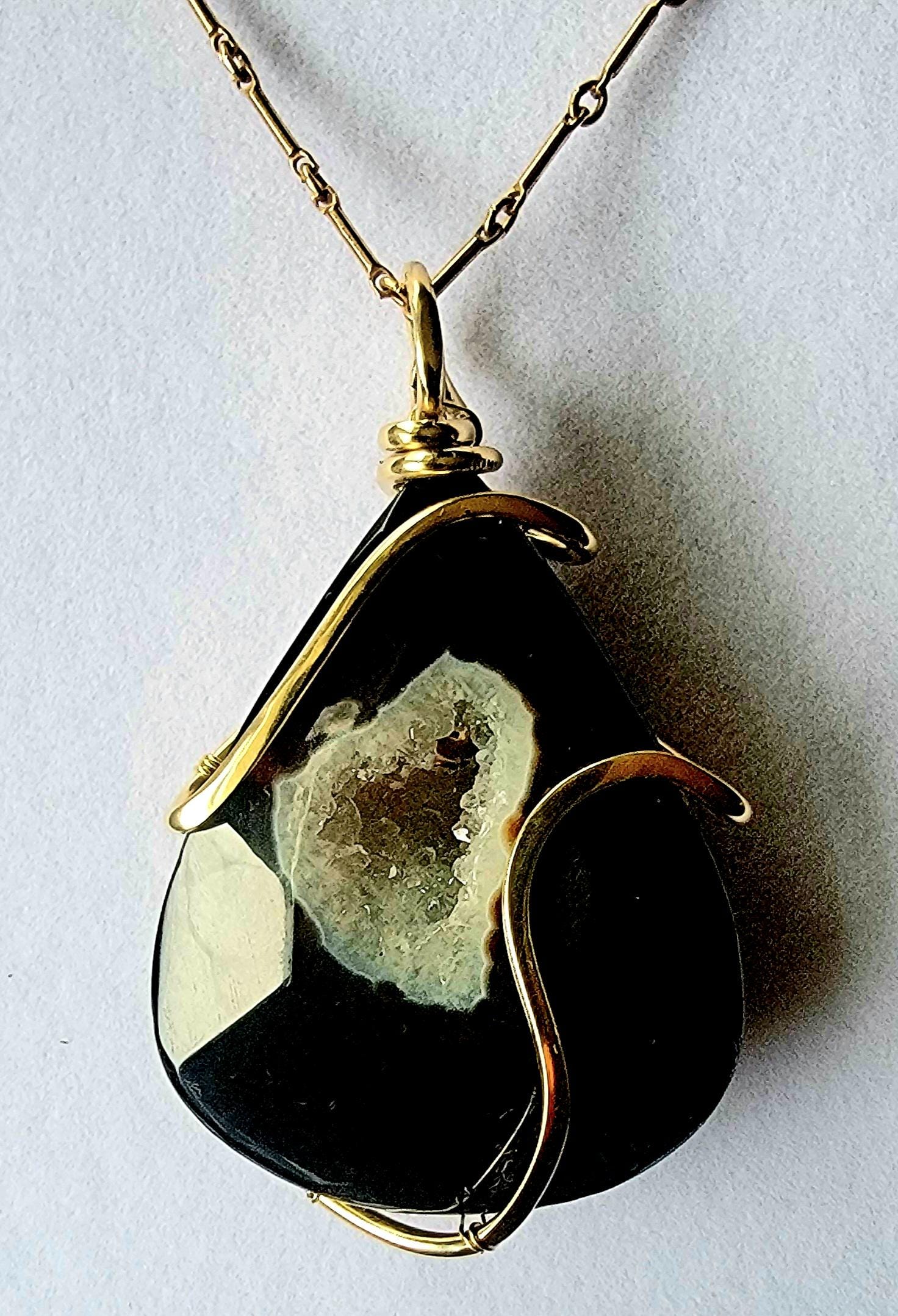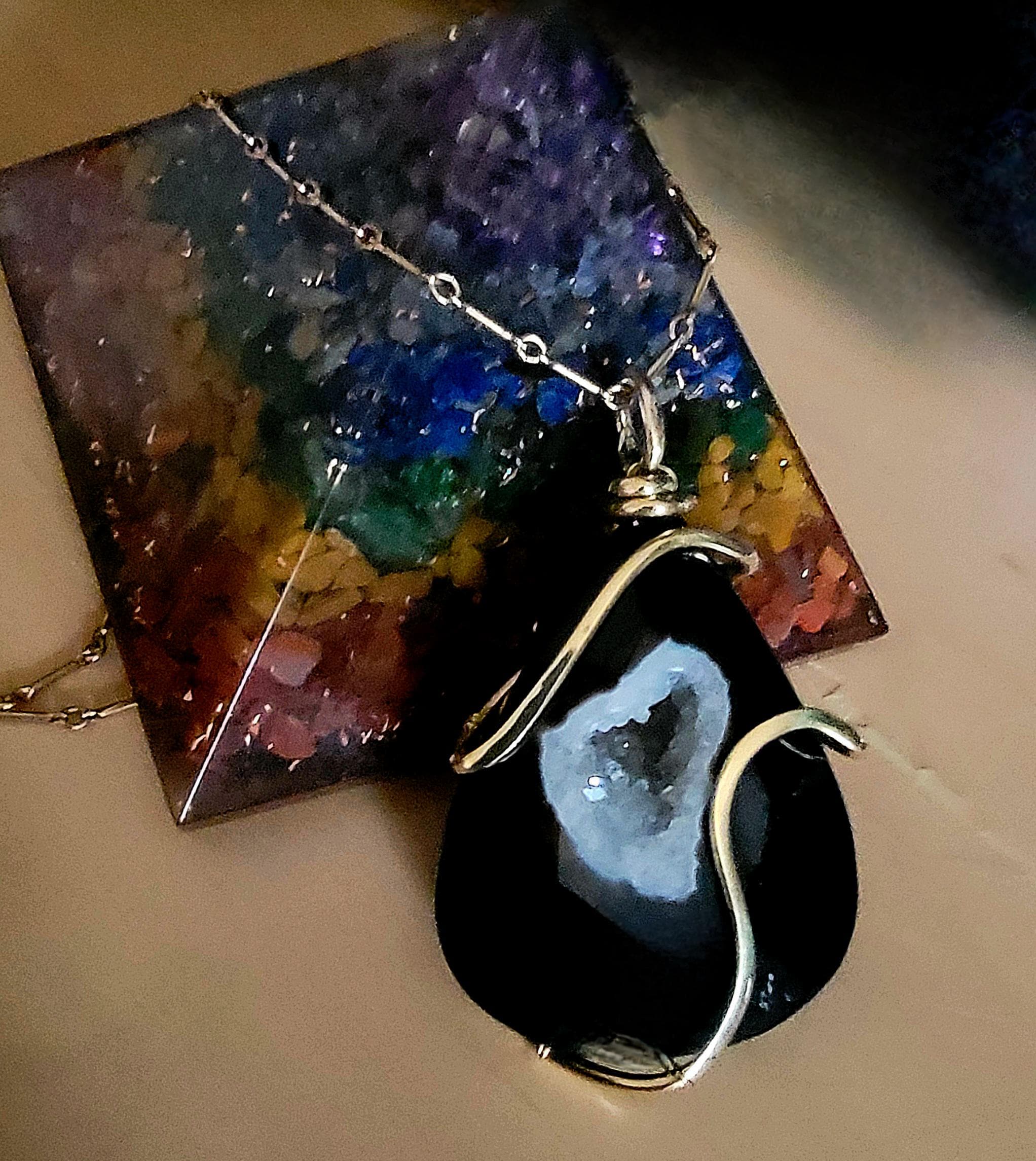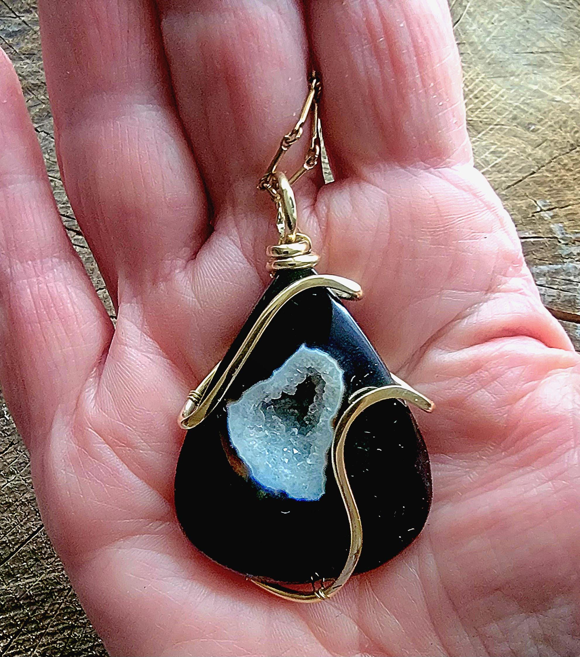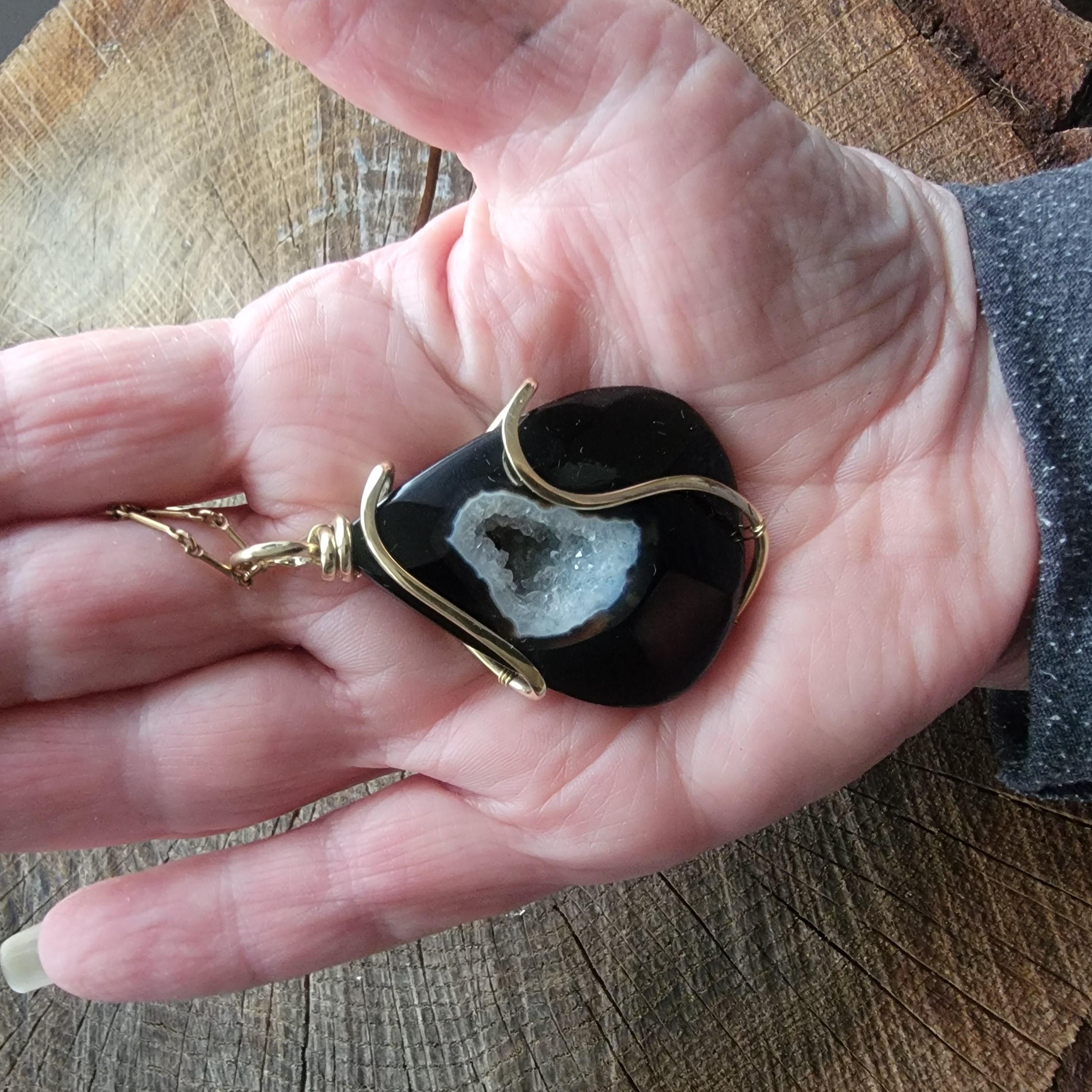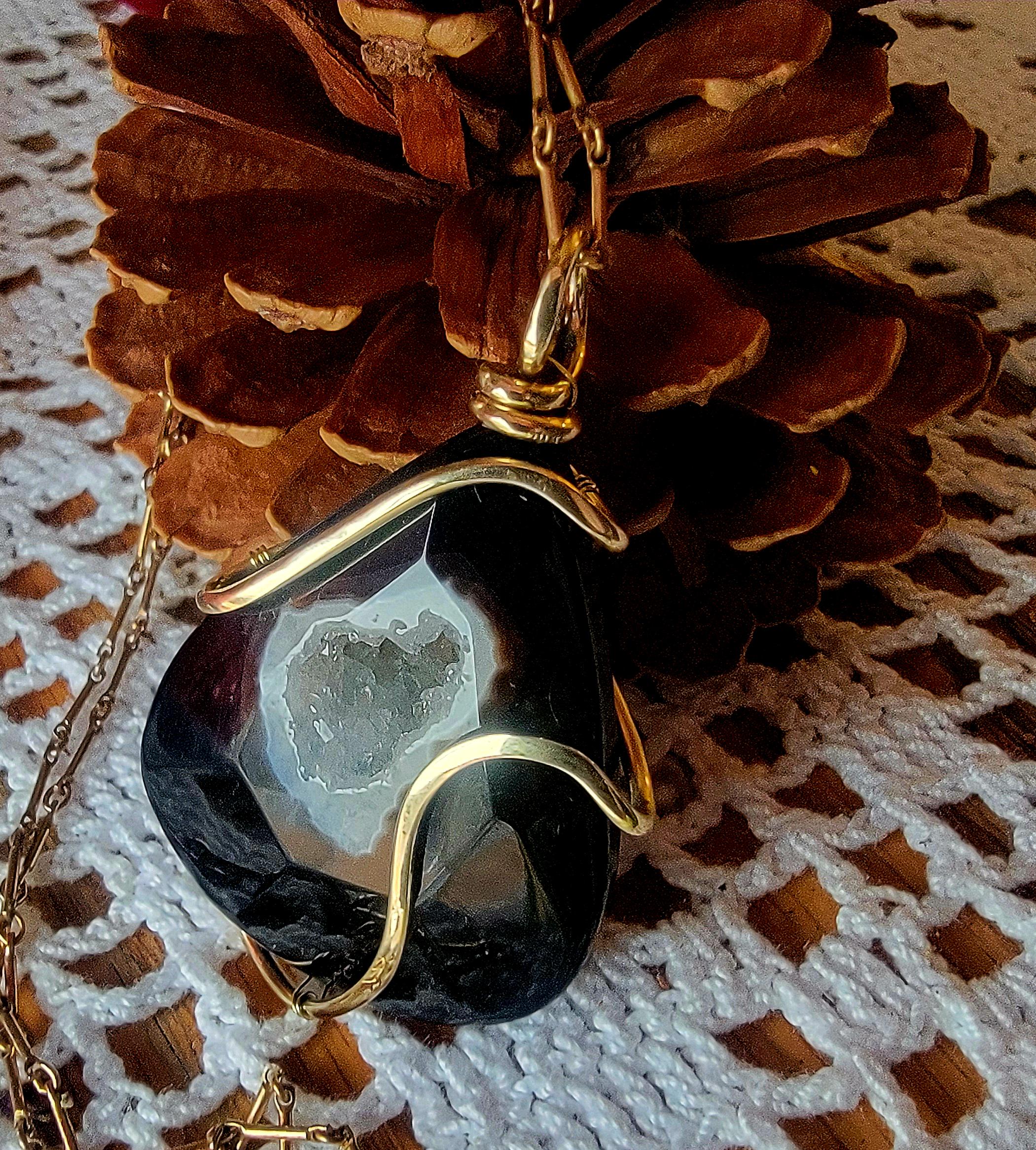 A simple and elegantly wrapped stone in a minimalist setting, this ample -sized druzy agate pendant is the definition of sophistication!